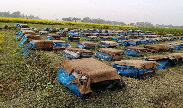 সরিষাখেতে মধুর জন্য মৌ বাক্স বসানো হয়েছে। সরিষার পরাগায়ন ঘটিয়ে মধু সংগ্রহ করে থাকে মৌমাছি। ফলে সরিষার ফলন ভালো হয় ও বাড়তি মধু পাওয়া যায়। প্রতিটি বাক্সে মাত্র একটি রাণী মৌমাছি থাকে। এবার উপজেলায় ৯ হাজার ৮১৮ হেক্টর জমিতে সরিষার আবাদ হয়েছে। সরিষার খেতে মৌমাছি ফুলের ওপর বসলে ফুলের পরাগায়নে ফসলের পুষ্টি বৃদ্ধি হয়। সরিষার ফলন ২০ ভাগ বৃদ্ধি পায়। মৌ চাষের কারণে এবার সরিষার ফলন ভালো হওয়ায় অন্য বছরের তুলনায় বেশি আয় হবে বলে জানান স্থানীয় কৃষকেরা।